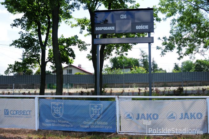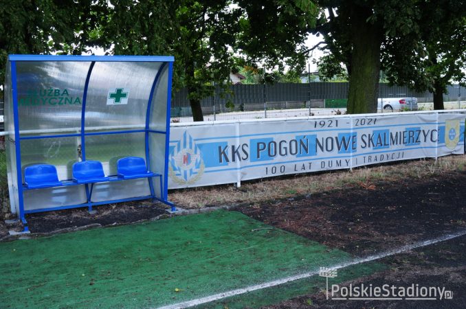 Stadion w Nowych Skalmierzycach, na którym swoje spotkania rozgrywają piłkarze miejscowej Pogoni, zarządzany jest przez tutejszy Urząd Gminy i Miasta. Obiekt przy ulicy Mostowej 1A powstawał na przełomie lat 20 i 30 XX wieku, a inauguracja miała miejsce 2 lipca 1933 roku. W latach 50 XX wieku stadion służył także żużlowcom nieistniającego już Kolejarza Skalmierzyce. Obecnie stadion w Nowych Skalmierzycach posiada jedną trybunę, w niewielkiej części zadaszoną z plastikowymi siedziskami i wydzielonym sektorem dla kibiców gości. Całkowita pojemność obiektu to 700 miejsc siedzących.